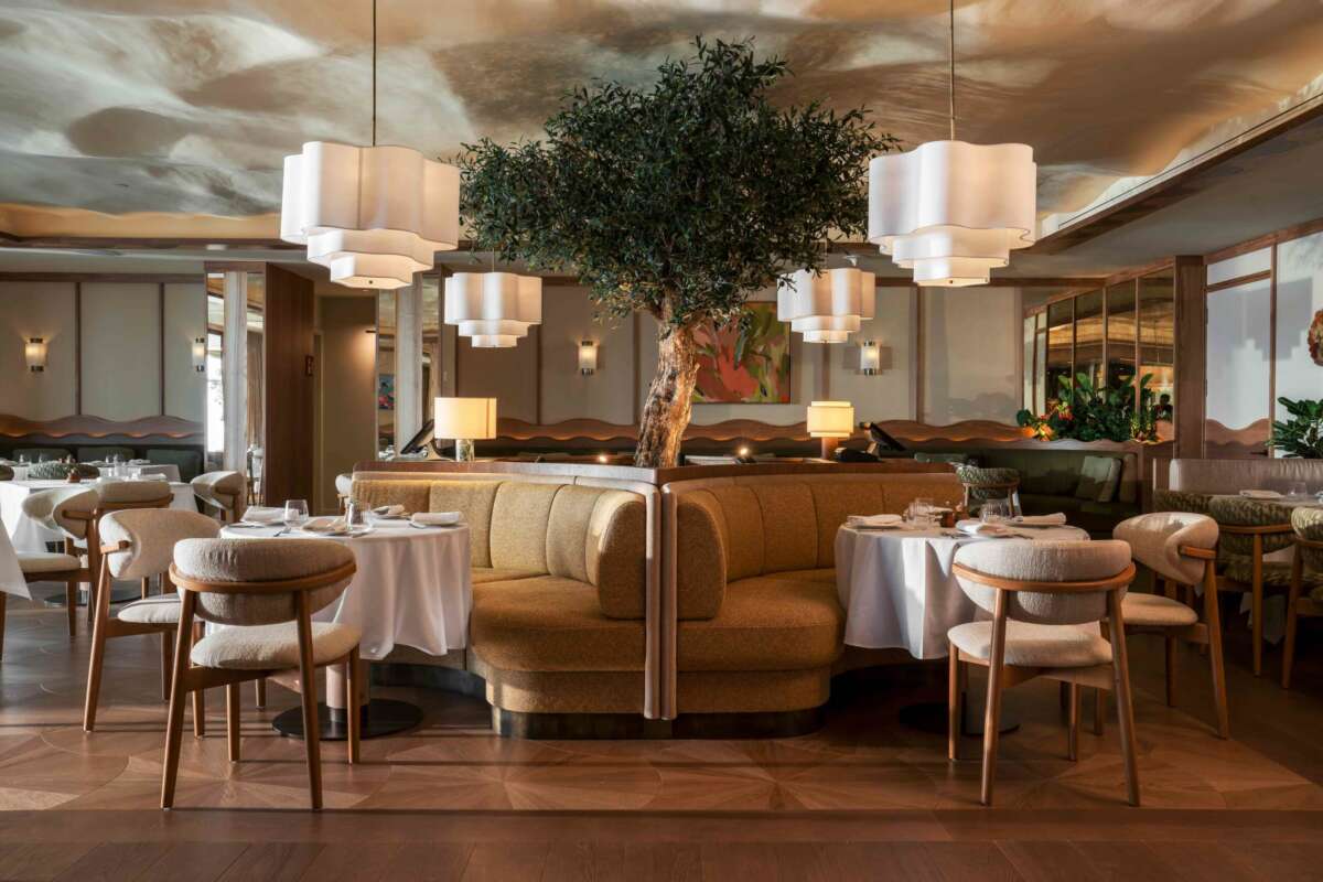 La estética de Albarada, a cargo de Astet Studio, se inspira en el Mediterráneo y en la corriente noucentista, donde los materiales naturales dialogan con la artesanía local y los colores suaves -cremas y marrones- evocan las sierras catalanas. Atención también al detalle del olivo en el centro de la sala.