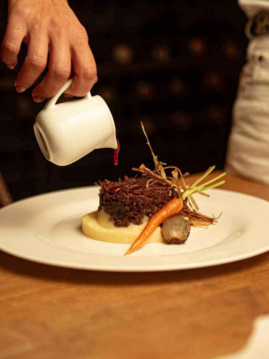 Explorando la carta, se descubren otros platos que son un puente al pasado, como el carpaccio de solomillo de ciervo con frutos rojos (según la gente de Arcano, “dialoga con el gusto medieval por los contrastes dulce-salado”) o el meloso de carrilleras al vino rancio, cocinado a baja temperatura y que recuerda los tiempos en que los ingredientes se aprovechaban al 100%.