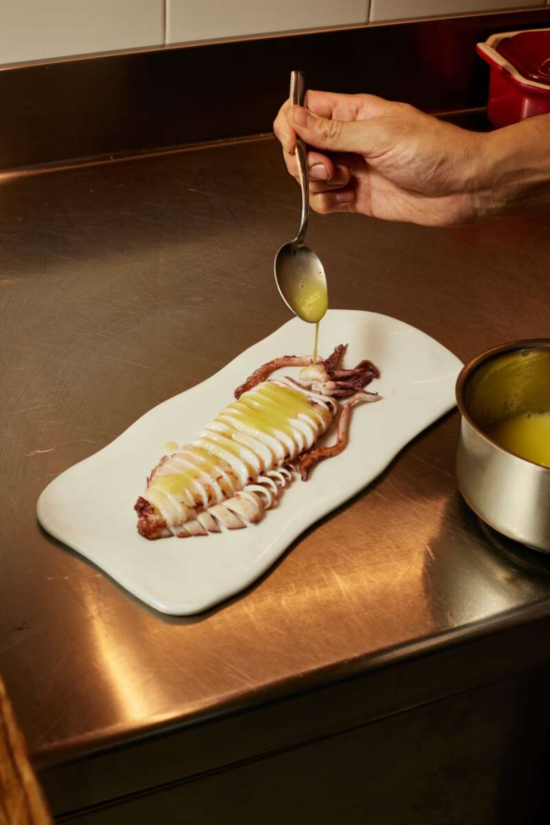 La combinación de ingredientes, que en otro restaurante permitiría sacar patente de sofisticación, aquí forma parte del día a día, como vimos con el puerro confitado con queso comté, sazonado con vinagreta de dátiles y avellanas; así como el calamar con pilpil y su tinta.
