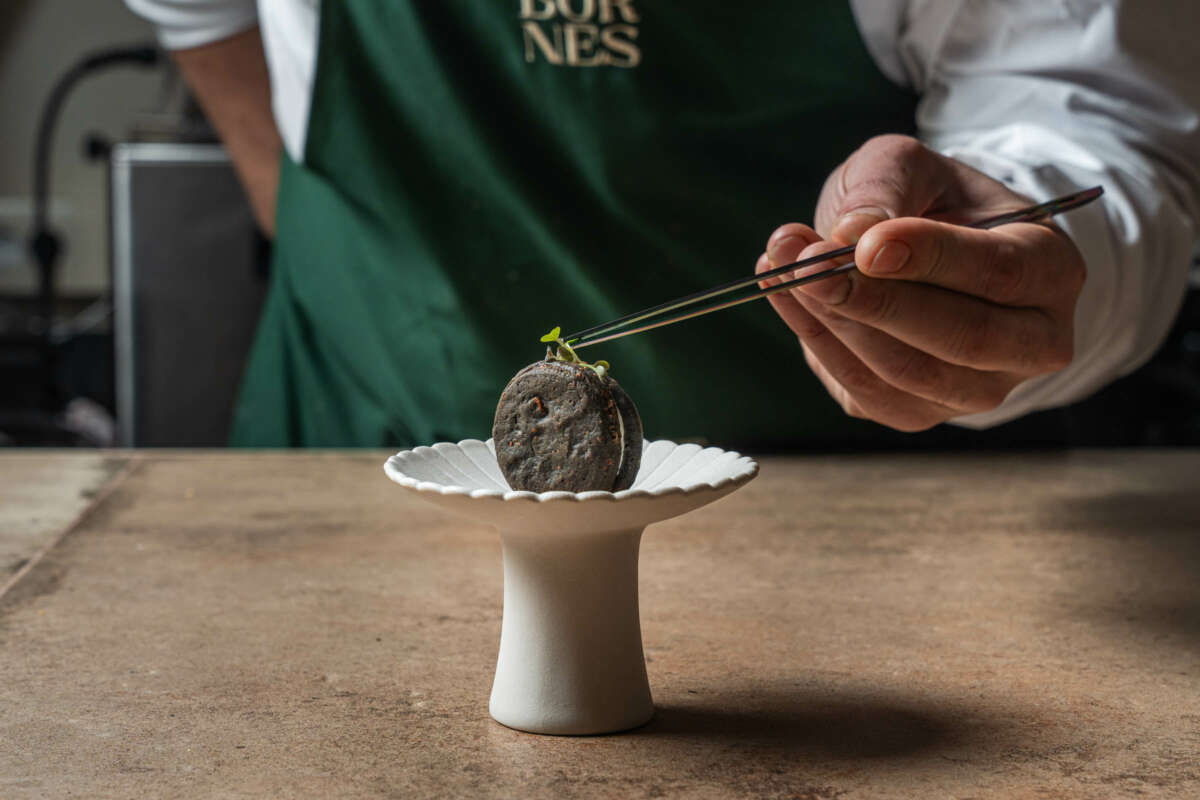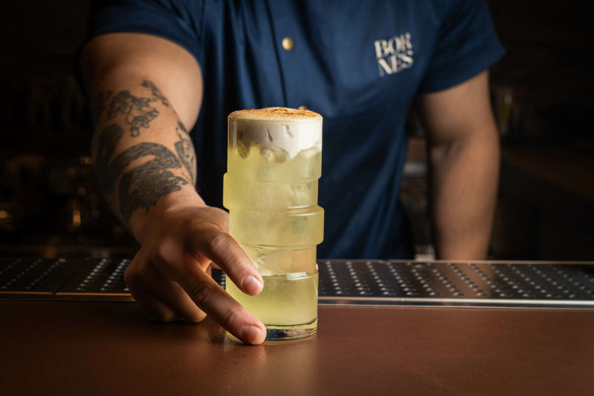 El restaurante, abierto el pasado diciembre, conserva sus paredes de piedra y sus arcos ciegos, muros con siglos de historia que dialogan con un mobiliario moderno de aires clásicos. Un detalle que sorprendió en nuestra visita fue que, en pleno sábado de temporal de invierno, el local estaba lleno a la medianoche; horario en que muchos otros ya están bajando la persiana. Esto da cuenta que en Bornèsuno puede venir a comer o cenar en plan tranqui, o quedarse hasta las tantas con una carta de coctelería a tener muy en cuenta.