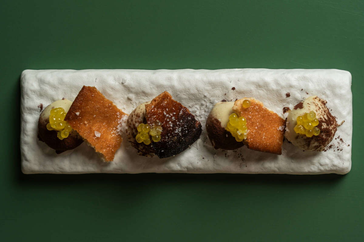 Esta selección de entrantes, elaboradas con paciencia artesanal, dialogan con otros pequeños platos como el buñuelo líquido de bacalao, el tartar de gamba roja y piel de pollo o la mini clotxa del Ebro.