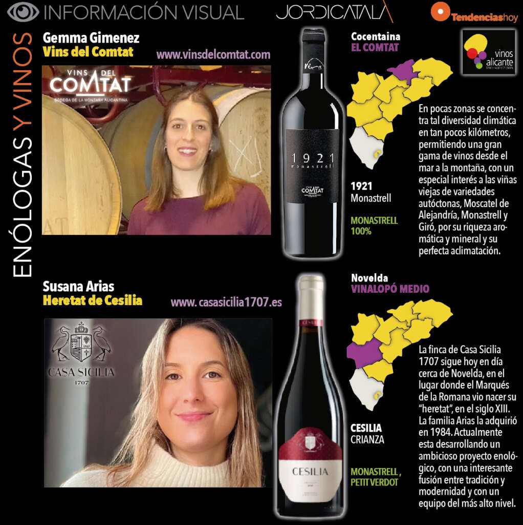 La participación femenina en los vinos de Alicante es cada vez más decisiva. El Consejo regulador de Alicante afirma que, en estos momentos, en las 29 bodegas envasadoras certificadas hay actualmente 14 enólogas, lo que supone un 48% del total, casi la mitad.