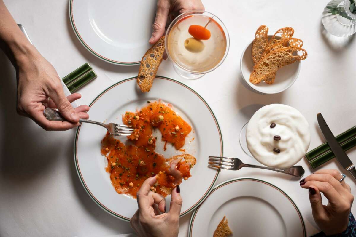 La sala de Finorri, luminosa y amplia, presenta una decoración levemente art decó que recuerda al Nueva York de los años ’40, con sus grandes lámparas de media esfera y sus sillones bajos tapizados de rojo, y con una larga barra con taburetes y vistas a la cocina abierta.