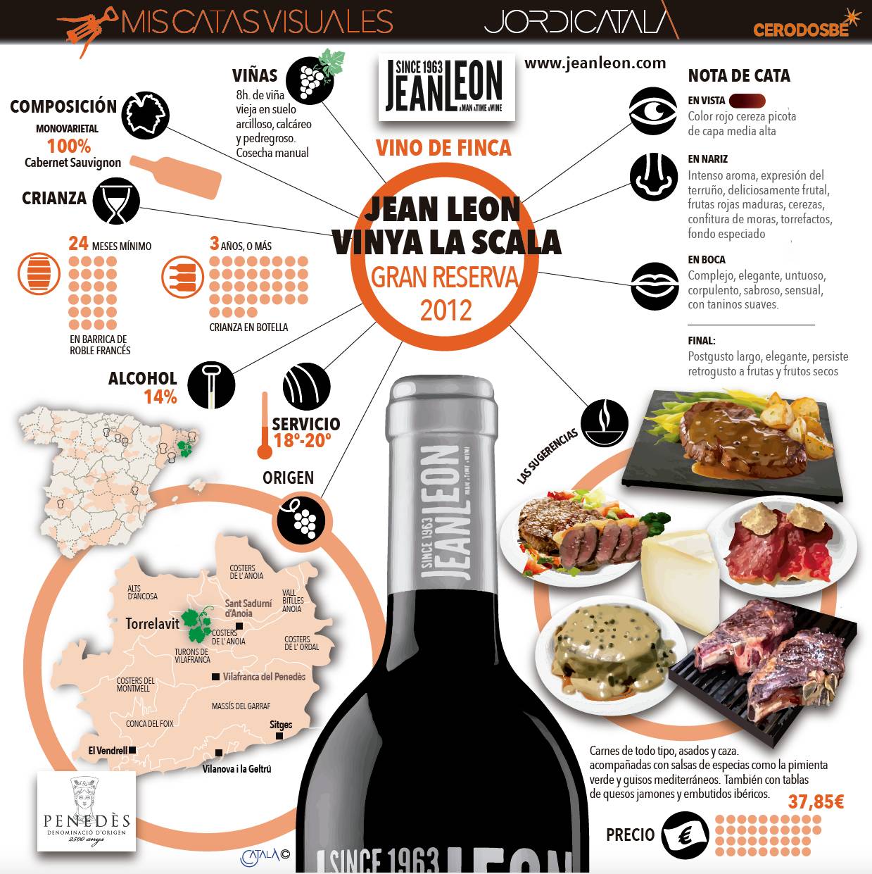 Jean Leon Viña Palau Merlot nace de una viña de 30 años. El nombre hace referencia a la ciudad natal de Jean Leon, Santander. El vino se cría durante 12 meses en tonel de roble francés y se añade un mínimo de 6 meses en botella.