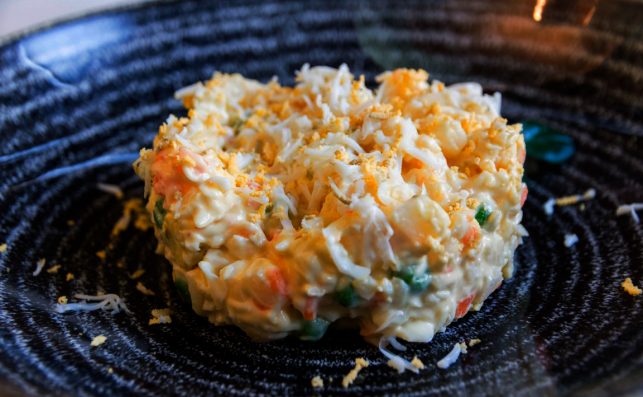 El atún, siempre del más barato y desmigado pues según el chef las partes menos nobles del túnido son las más sabrosas. ¿El truco para que esté tan melosa y suave y uno quiera comer más y más? Sencillo, es una ensaladilla rusa a la que no se le adicionan ni encurtidos ni cebolla.