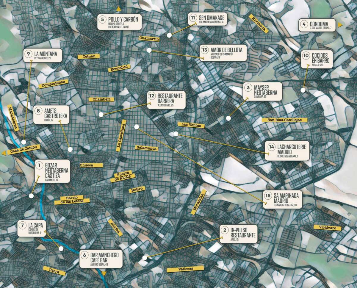 Un mapa y un recorrido que va de norte a sur y de lo más castizo a lo más contemporáneo, donde conviven tradición y vanguardia, memoria y creatividad, barrio y alta cocina y que compone una mirada diferente, amplia y diversa pero, sobre todo, representativa del momento gastronómico que vive Madrid.
