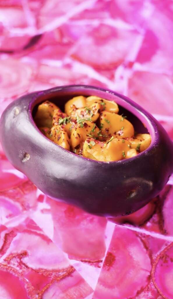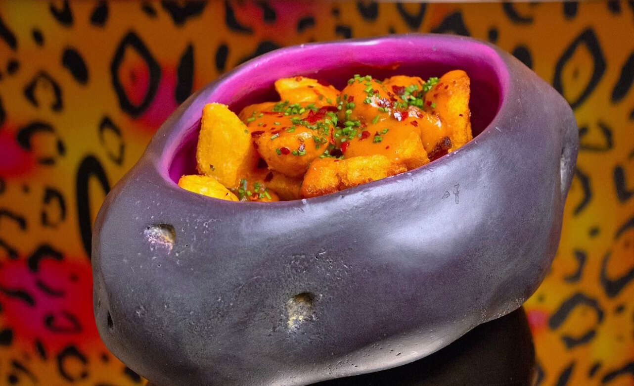 Como apunta Alfaro, orgulloso de sus raíces madrileñas y de tradiciones culinarias como los bocadillos de calamares o las tapas de oreja, la receta parte de bolitas de patata agria confitadas en aceite de oliva con ajo y hierbas aromáticas, fritas hasta lograr el equilibrio entre cremosidad y crujiente a las que se añade la salsa, que en este caso se elabora con fondo de cocido, pimentón, chile chipotle, vinagre de Jerez y huesos de jamón.