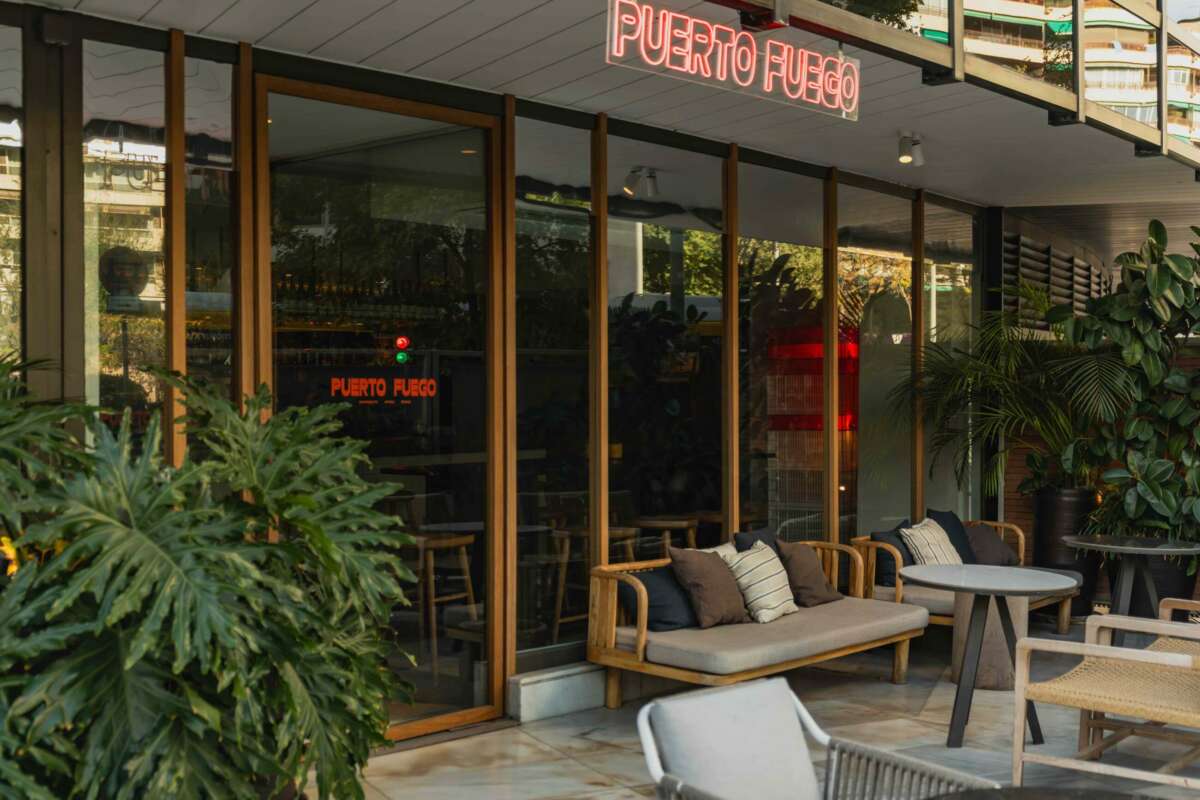 Esos ingredientes son los que se ven en el nuevo Puerto Fuego, el establecimiento que el Grupo Trapío abrió hace pocas semanas en Flos i Calcat 18, en el mismo local donde estuvo el restaurante Alrevés. Poco queda de su antecesor: el nuevo proyecto ha reformado la estética con un interiorismo diseñado por Elefant Studio, donde, entre muebles de tonos cálidos, destacan algunos elementos rupturistas como unas sillas colgadas del techo, un despliegue de luces de neón de colores, un mural colorido que preside la sala y varias luces rojas (entre ellas, la de un semáforo) para dar la sensación de estar cenando rodeado de brasas.