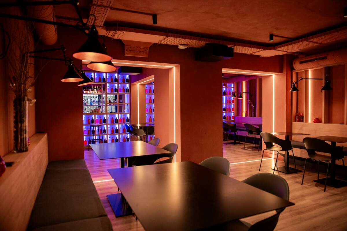 El restaurante se divide en dos plantas, con una estética de aires minimalistas con una combinación de madera clara, metal oscuro y piedra natural. Además de la pequeña sala a pie de calle, en la planta superior, además de un privado para una docena de comensales, hay dos espacios diferentes, del que uno de ellos resalta con sus anaqueles de destilados iluminados por luces azules. Sí, otro guiño al mar.