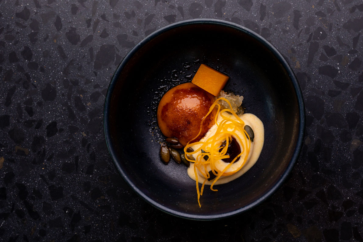 Ya en los postres, en ambos menús se cierra con el Dulce y cremoso(boniato, calabaza y caramelo de cabello de ángel) y el Repostería vegetal(macarrón de hinojo con gominola de saúco y pera).
