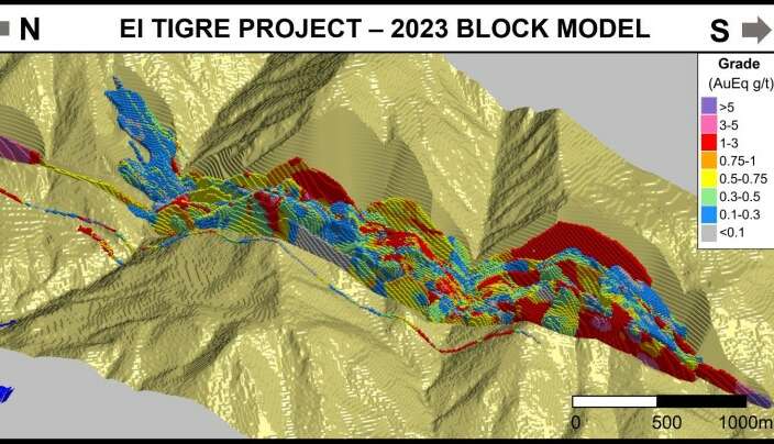 Los recursos minerales del proyecto El Tigre pueden explotarse tanto a cielo abierto como por métodos subterráneos. Los recursos minerales inferidos fuera de la mina, con una ley de corte de 263 g/t AgEq (3,5 gpt AuEq), contienen 32,4 Moz de onzas AgEq con una ley de 400 g/t AgEq en 2,5 Mt
