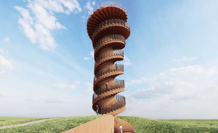 La escultural torre en doble espiral, de 25 metros de altura y diseño del estudio de Bjarke Ingels, ofrecerá hermosas vistas de los humedales del Parque Nacional del Mar de Wadden