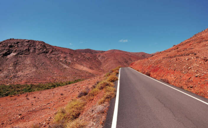 El extremo norte de la isla canaria de Fuerteventura presenta el azul del océano en contraste con el amarillo de las gigantescas dunas del Corralejo, a los que se suman el blanco de los pueblos de pescadores y el beige claro de sus playas