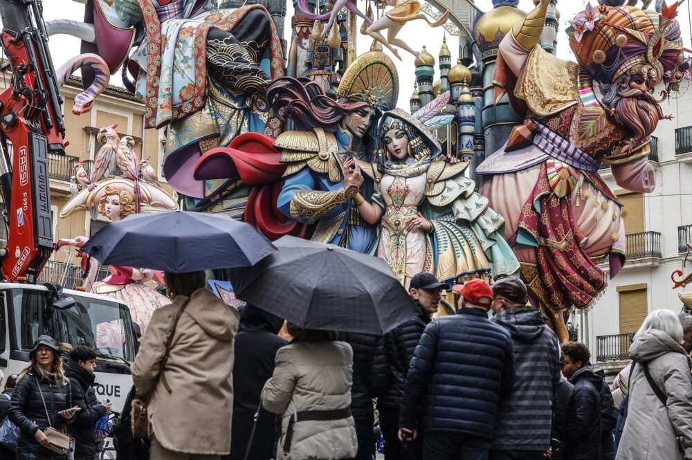 (Foto de ARCHIVO) Varias personas con paraguas observan la falla Convento Jerusalén durante su montaje, a 14 de marzo de 2025, en Valencia, Comunidad Valenciana (España). Rober Solsona / Europa Press