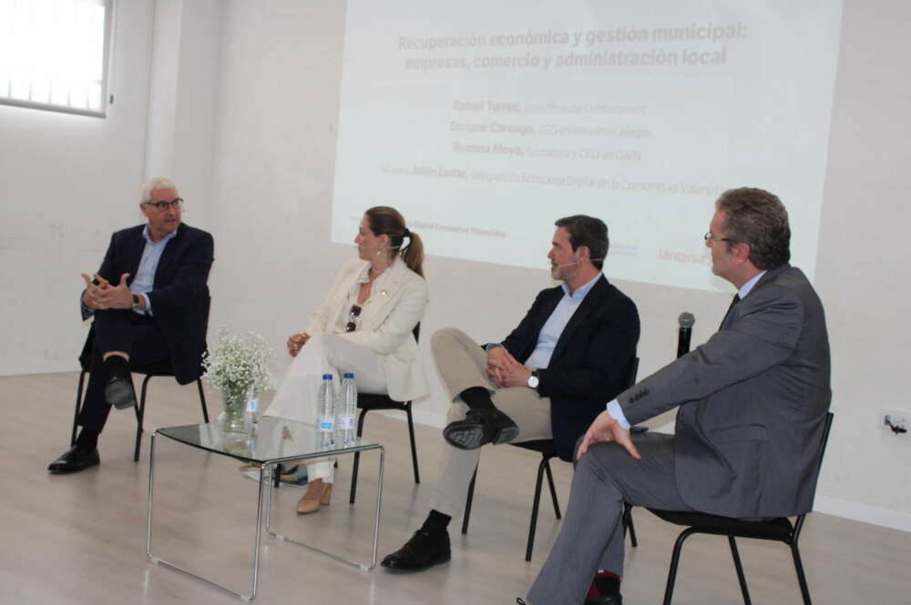 Mesa del II Foro La Reconstrucción de Economía Digital con Rafael Torres, presidente de la Confederación de Comercio de la Comunidad Valenciana (Confecomerç CV); Enrique Careaga, CEO de Industrias Alegre, y Romina Moya, fundadora y CEO de GAIN, moderada por el delegado de Economía Digital en la Comunidad Valenciana, Julián Larraz.