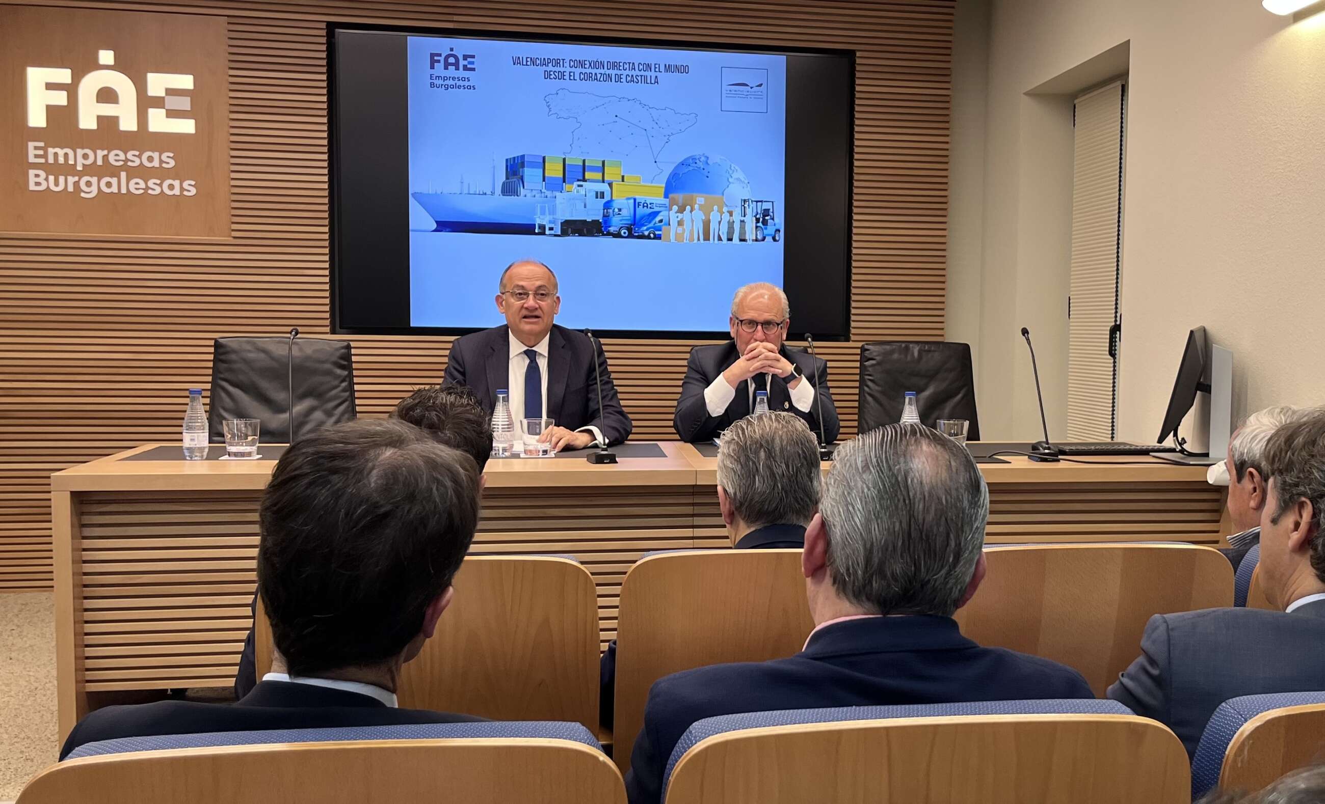 Joan Calabuig pone en valor la eficiencia en la carga y descarga de contenedores, la capacidad de operar barcos de 25.000 TEU y la conectividad con todo el mundo para seducir a los empresarios burgaleses