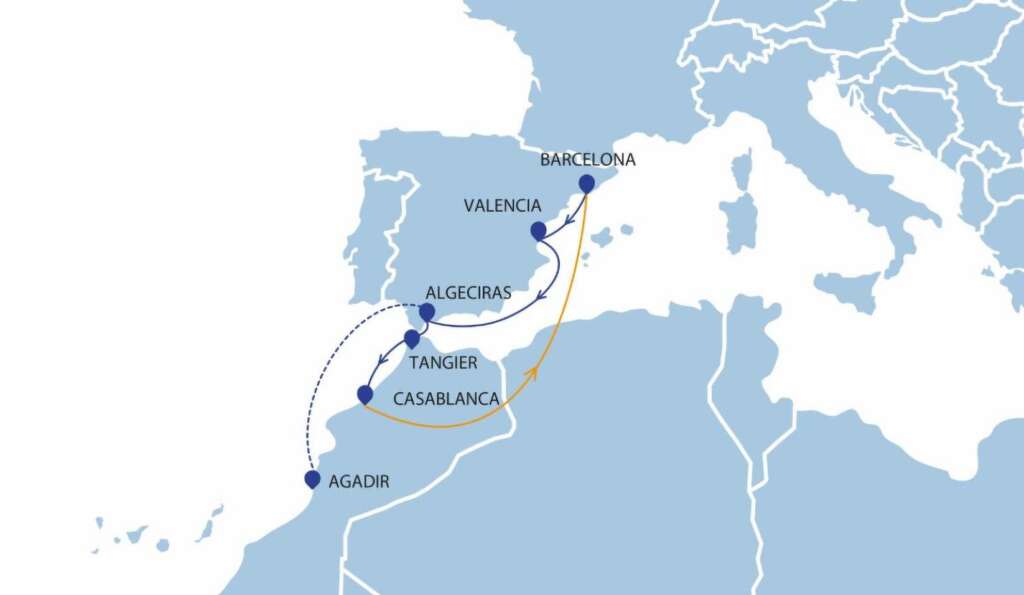 Según ha explicado la compañía, esta nueva rotación integra los puertos de Barcelona, Valencia y Algeciras con Tánger Med, Casablanca y Agadir, con varias salidas semanales, lo que permite establecer un enlace estable y seguro tanto para operaciones de importación como de exportación entre ambos lados del Estrecho.