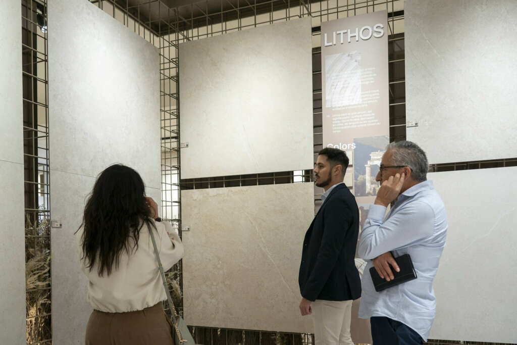 Lithos, por su parte, explora la belleza del paso del tiempo sobre la piedra. Inspirada en procesos geológicos naturales, la colección incorpora erosiones suaves, matices minerales y estratificaciones sutiles que aportan profundidad visual y una elegancia serena a los espacios, transmitiendo sensación de permanencia y equilibrio.