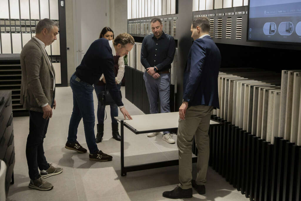 Otro de los grandes focos de esta nueva experiencia es Immersive Play, la propuesta presentada en Cersaie que ahora cobra vida dentro del showroom. Este concepto permite simplificar la elección y visualización de materiales mediante experiencias más intuitivas, realistas e interactivas, facilitando el trabajo de arquitectos, interioristas y clientes finales, y transformando el proceso de decisión en un recorrido mucho más natural y fluido.