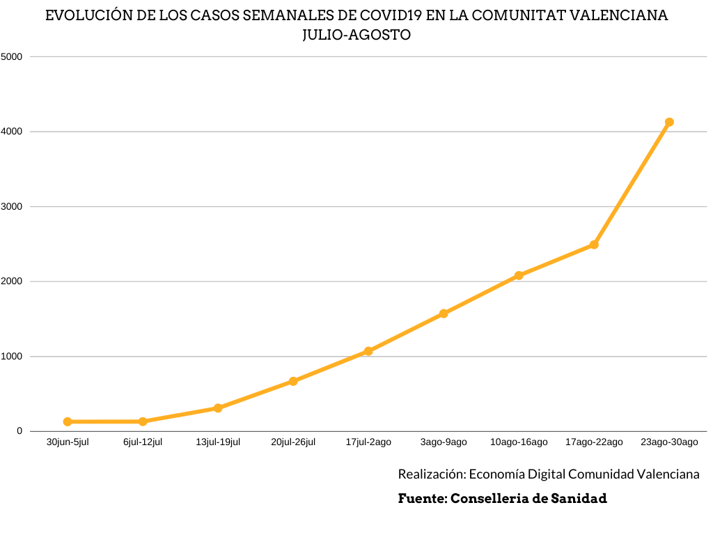 En agosto, el aumento exponencial era incuestionable. Por semanas: 1.573, 2.081, 2.492 y esta última 4.128. A continuación, el gráfico que muestra el pronunciado incremento de los contagios en dichos meses.