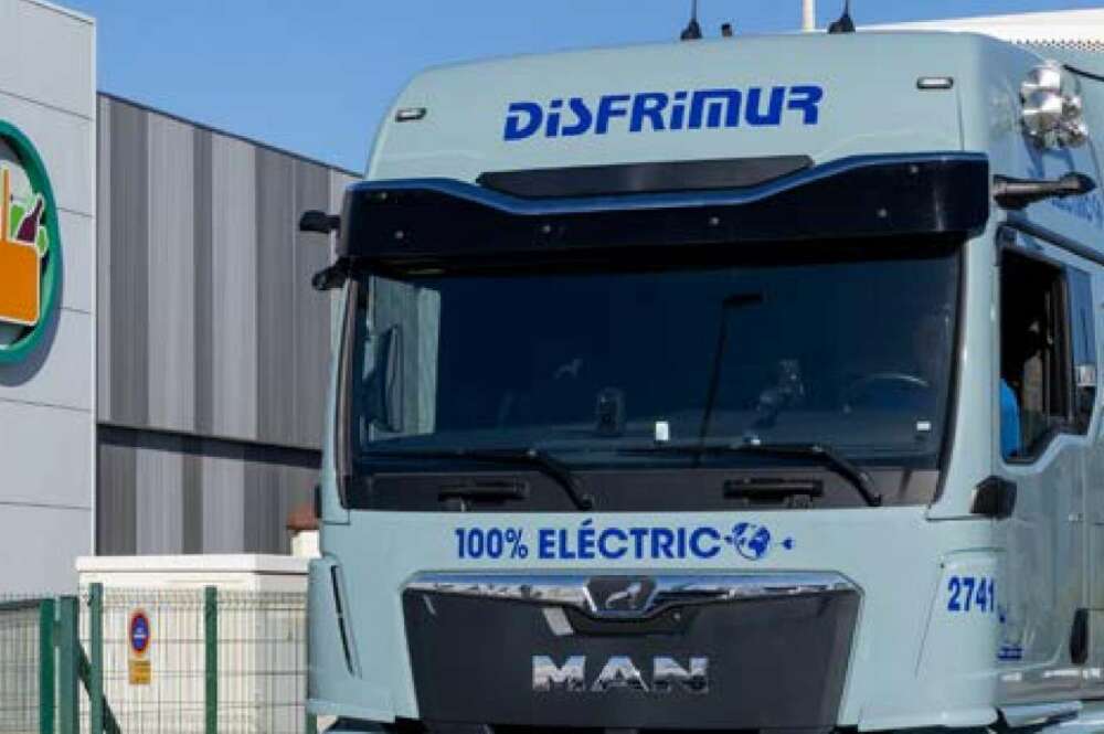 Tràiler elèctric del proveïdor Disfrimur descarregant en una botiga de Mercadona a Torrevella (Alacant).