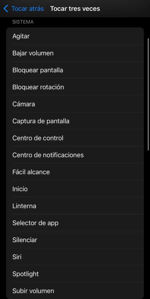 Pero en la parte inferior de este apartado, nos encontraremos con la categoría Tocar Atrás. Una vez activado, nuestro iPhone nos brindará la posibilidad de seleccionar entre dos o tres toques, en función de la opción que prefiramos, para llevar a cabo una serie de acciones que el propio teléfono nos recomienda desde este mismo apartado.